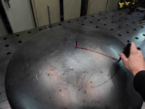 dibuja un círculo donde crees que las piernas deben fijarse al recipiente más adelante. no muy lejos hacia el exterior, forma un poco más de la mitad de la mitad se ve bien. sólo pegue el taladro en el agujero central y utilizar un trozo de cuerda como una brújula... fácil.
