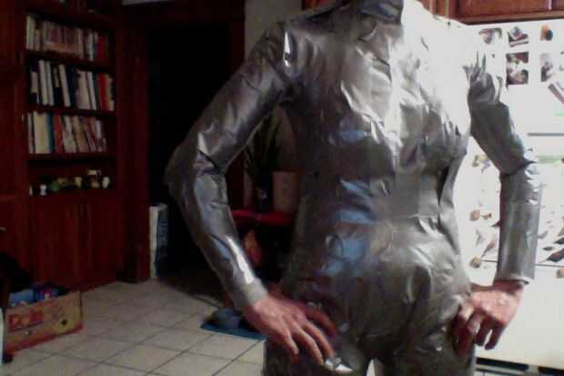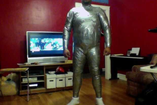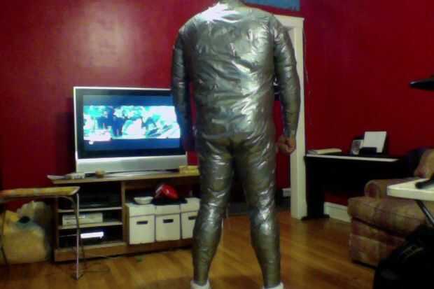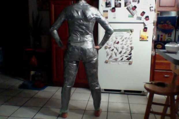 2) agarrar la cinta y empezar a rasgar tiras para poner en tu traje. No simplemente coloque 1 correa de la cinta a la persona y envuélvalo alrededor de su cuerpo. Necesita varias tiras más cortas. La razón de esto es porque el traje de cinta de conducto será muy apretado en la persona que están grabando para arriba si usted sólo mantener envolviéndolos en tiras continuas de 1. Se ajuste, que puede causar constricción arterial y mala circulación... Así que recuerde. Múltiples tiras tira continuo largo > 1