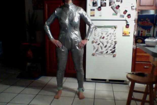 3) cinta todo lo... Cuerpo, rodillas, brazos, codos, cuello, ingle, etc.. Al llegar al cuello, agarra su abrigo de saran y crear un collar falso primero si la camisa no se extiende lo suficientemente alto.