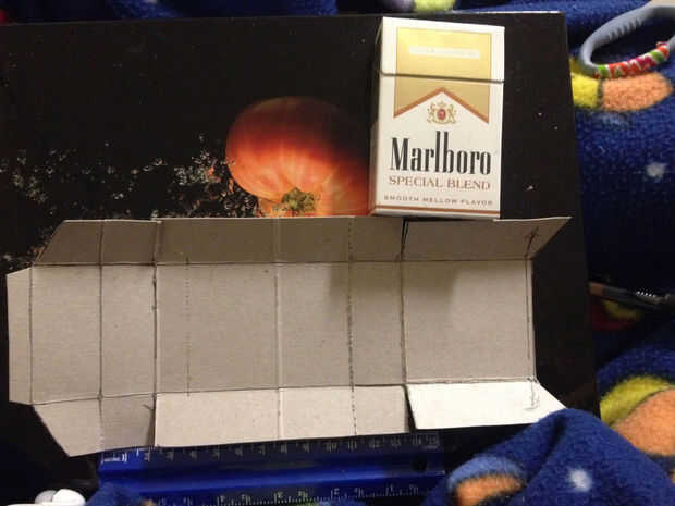 Usando la plantilla adjuntada, o trazando su propia caja de cigarrillo, crear una plantilla en la cartulina y recórtalo. Asegúrese de que se ajusta perfectamente alrededor de la caja de cigarrillos. las líneas punteadas son los pliegues y líneas continuas son para cortar. Me mira el pdf en lugar de la imagen de cartón en este caso para el corte más preciso y las líneas del doblez. (Al parecer el pdf no funciona para algunas personas así que me imaginé cómo guardar como jpeg así.) También usé mis tijeras para marcar las partes de la caja para ser doblado por lo que convertiría hacia fuera recto y fácil de plegar.
