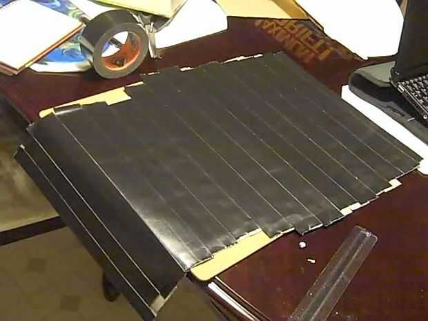 En primer lugar establecer una franja del lado adhesivo de la cinta un poquito más alto que la altura de tu libro de texto. Luego establecer otra tira de cinta sobre la misma longitud de tira de cinta de hasta la mitad hacia abajo. Doble la parte pegajosa de la primera cinta sobre la boca abajo de la cinta. Puede sonar complicado, pero su bastante fácil. Voltee esa pieza entera y poner otro pedazo de cinta boca abajo, misma longitud, en la parte pegajosa de esa pieza. Mantenga repitiendo este proceso hasta llegar fíbrico aproximadamente 6 pulgadas de largo mayor que tus libros cuando está completamente abierta.