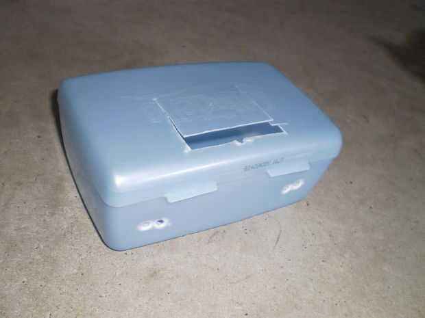 Empezar por meter cuatro agujeros en el lado donde están las bisagras para las uñas. Ponerlos en pares a cada lado como se muestra en la imagen. A continuación, corte un agujero rectangular cerca del lado de las bisagras en la parte superior de la caja sólo lo suficientemente grande como para la parte de madera de la ratonera caber a través. Luego cortar aberturas de 2 pulgadas a cada lado de la forma rectangular agujero justo cortar líder al otro lado de la caja como se muestra en la imagen. Por último, en la parte inferior de la caja, orificio de 2 por 2 pulgadas a partir del extremo más cercano a la pieza con bisagras de la caja. hacer un poquito más grande que el agujero de un trozo de cartón y poner cinta solamente en el la parte superior para que el cartón permite girar hacia arriba.