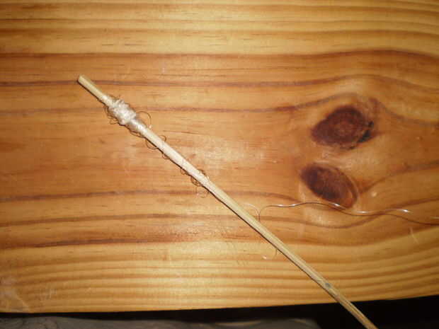 Tomar su lápiz o pincho de oficial y atar una buena longitud de sedal sobre él. Tome la goma y Envuélvala alrededor del nudo para que la línea de pesca no resbalará de la brocheta. envuélvalo todo y guardarlo para más adelante.