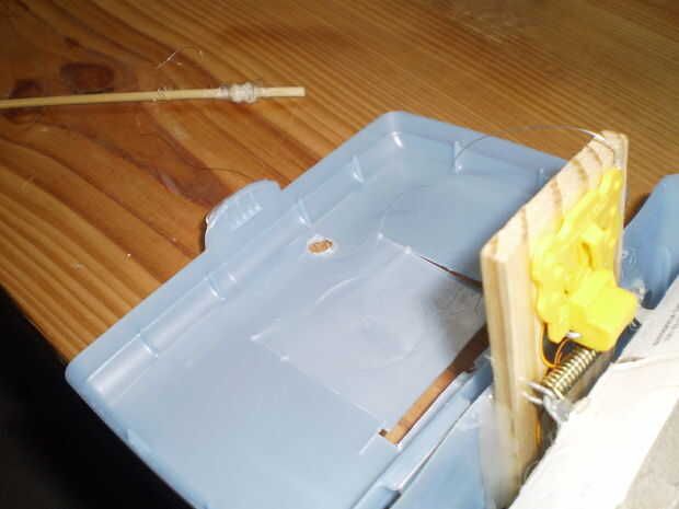Un agujero en la mitad superior de la parte superior de la caja. Tomar el lápiz o el pincho con la línea de pesca y pase a través de este agujero luego atarla en un agujero en la cosa de la placa donde sería el cebo para ratones si estábamos usando la trampa para su uso previsto. Si su tener problemas, mira en el cuadro.