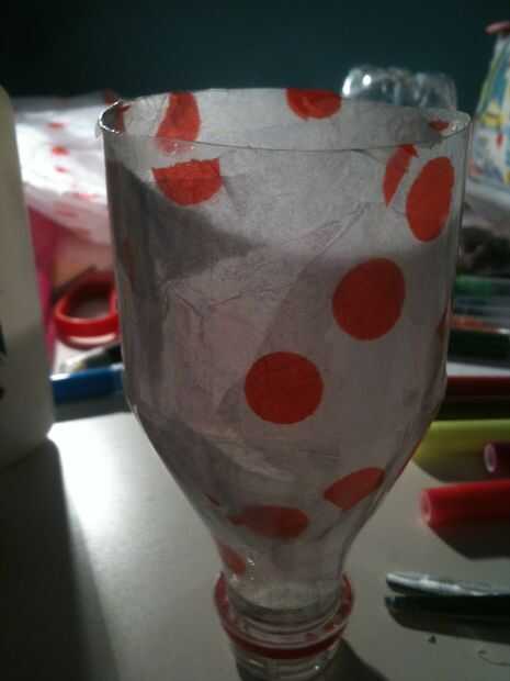 Dibujar algo en la parte inferior de la mitad de la botella, luego papel maché el interior de la parte superior medio usando papel y pegamento PVA!