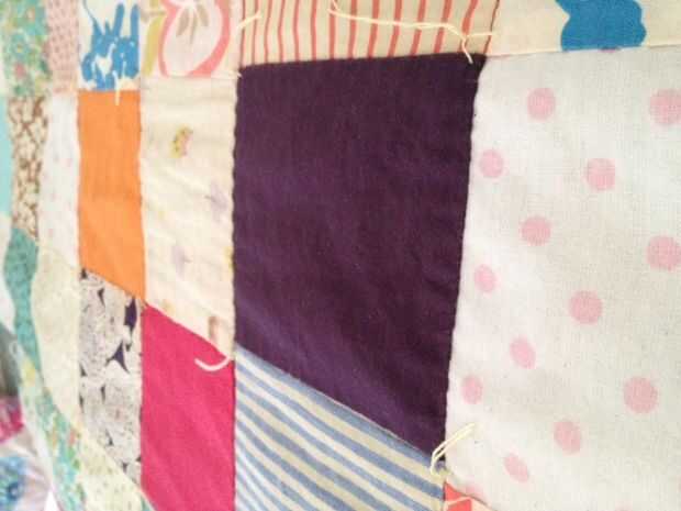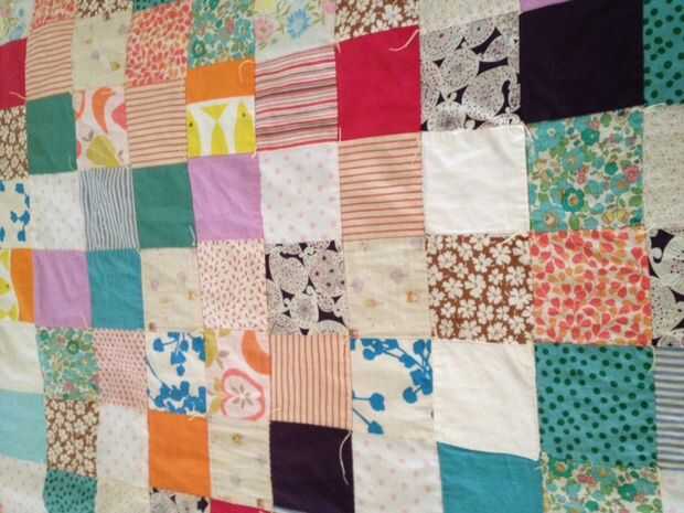 La tela era hermosa y me inspiraron a abandonar el miedo y pruébalo. He descubierto que cortar cuadrados de 4 1/4" y alineados en filas y coser juntos fácilmente hicieron un hermoso mosaico del edredón. Y pasa nada si ellos no perfectamente alinean, por lo soluciona el problema de matemáticas y todo problema 'ligeramente perezoso'. Lo mejor de todo, me encontré con buen uso de todas esas prendas que acumulado cuando mis abuelos se habían ido. Cortar cuadrados de sus trajes, vestidos, pijamas, pañuelos y fundas de almohada. Me entristeció que mi hijo nunca iba a conocerlos. Pero su amor se cose en esta manta que le mete en cada noche.