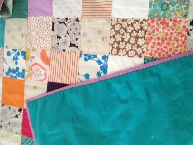 La forma torcida le ayuda a conectar las tres capas juntas. Prender cada pocas pulgadas. Recortar la tela sobrante de su bateo y forro de tela a un cuarto de pulgada más allá de la capa superior del tejido. Ahora usted está listo para coser en la Unión. Hay un gran enlace de tutorial de la aquí: del http://www.purlbee.com/quarter-quilt/2006/11/9/binding-the-quilt.html
