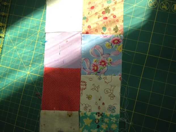Una vez que hayas cortado tus franjas hacia abajo en cuadrados de 4 1/4 estará listo para montar la pieza superior.