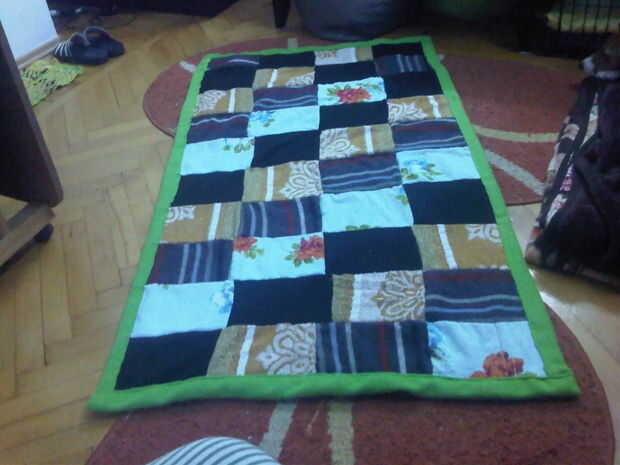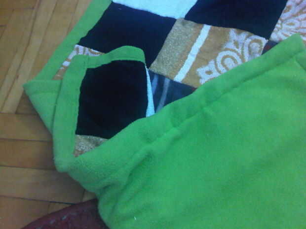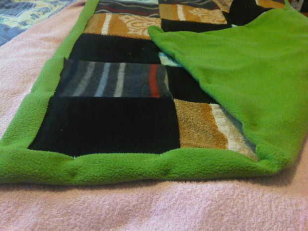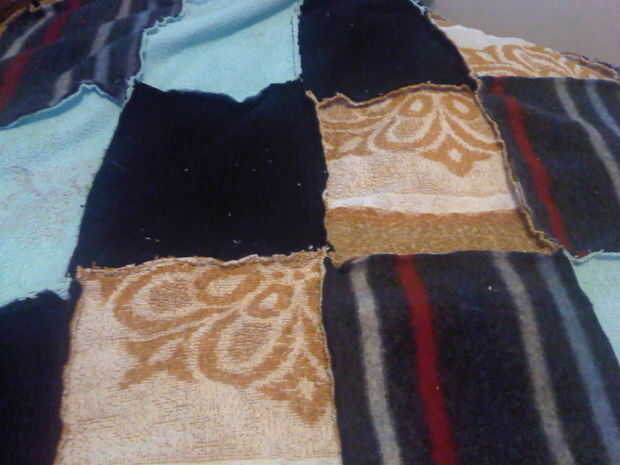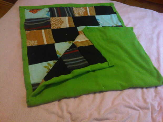 -viejo restos de materiales o lo que he usado: 2 suéteres que encogido en la lavadora, una toalla más viejo y una manta (verde) para la espalda.