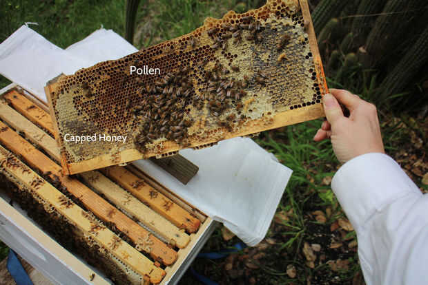 Una vez que has encontrado a tu Reina, busque en sus marcos de cría para encontrar dos que se llenan de polen y néctar o miel. Y me refiero, lleno a rebosar. Sus abejas van a necesitar mucha comida para mantener sus larvas de Reina gorda y feliz, y la comida más reciben a las reinas más pueden hacer. Néctar y miel son generalmente más fácilmente disponibles en una colmena de polen, así que si eres poco polen entonces puedes tomar 2 marcos de miel y alimentación un suplemento de polen.