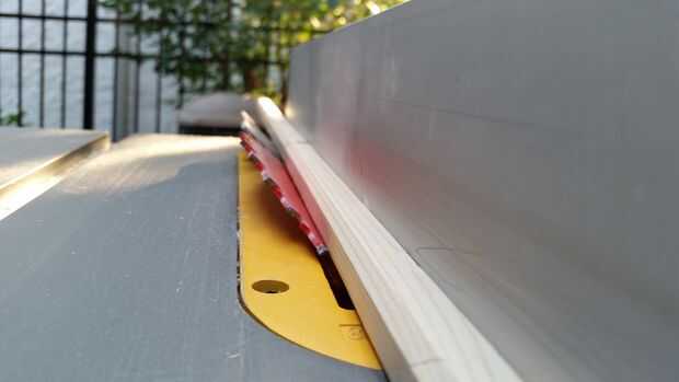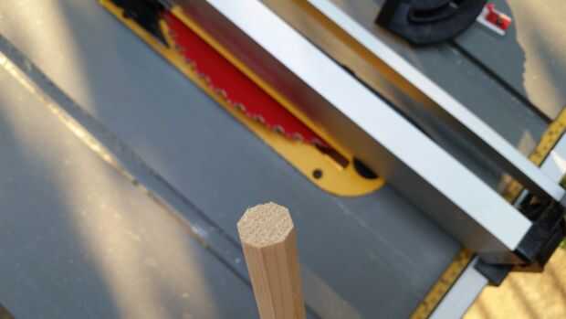 OK... ahora juego la hoja en un ángulo de 45 grados y lob de las esquinas de las piezas para que el cuadrado de las secciones transversales se convierten en octógonos. Dependiendo de donde la Sierra de mesa disco gira le deba mover la valla en hacia la cuchilla un poco. Experimento