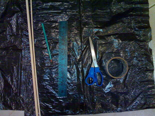 Se necesitan: tijeras, una regla, tres bolsas de basura, un lápiz, cinta y dos tacos de madera. (La espiga de la columna vertebral debe ser 10 milímetros de grosor y 95 centímetros de largo, el pasador para el mástil debe ser 6 milímetros de espesor y 90 cm de largo). También debe tener un rollo de cuerda.