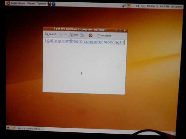 Presione el botón de encendido (que usted debe han incorporado en su diseño ya) y ver si su ordenador funciona.  Si es así, buen trabajo, usted sólo construyó una computadora de cartón!!!!!!  Si no, probar y arreglar.  Si todo falla... Revise y ver si el monitor está conectado al ordenador.  Sí, era lo suficientemente estúpido para dejar al monitor desconectado y tratar de probarlo.  ASEGÚRESE DE QUE SU MONITOR ESTÉ ENCHUFADO EN EL ORDENADOR!!!!!!  Y LA PARED!!!!!!