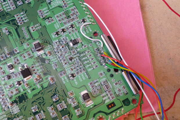 En el ejemplo de (Foto 2) era para salida VGA. Tenga en cuenta, es una buena idea usar una resistencia de 150 ohm en el V-Sync y también líneas de H-Sync si está utilizando el modo VGA y la imagen es demasiado brillante, y si la calidad de imagen no es totalmente estable, utilizan un capacitor de 220uf en cada una de las líneas roja, verde y azul (es decir RGB).