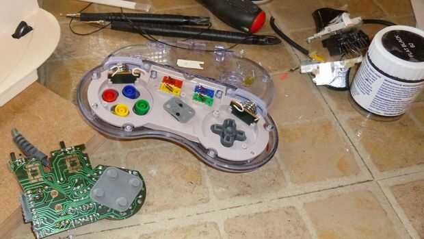 Utilizar el antiguo controlador SNES, puedo utilizar el tablero de los rastros de él, cortar a la medida y conecte los contactos del botón. Esto es útil ya que supone que el d-pad funcionará confiablemente como trabaja la misma manera como fue originalmente en la unidad SNES. (pic 3, pic 4)