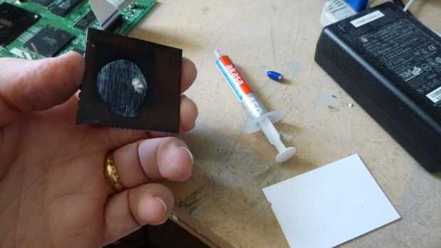 Por lo tanto, utiliza alguna pasta térmica Arctic Silver un disipador limpio y suave, sobre la cantidad de un grano de arroz (Foto 1). Unte la pasta con un trozo de cartón plano, por lo que la cubierta es delgada pero la pasta cubre el disipador térmico con forro. También lo hacen igual para las fichas (Foto 2).