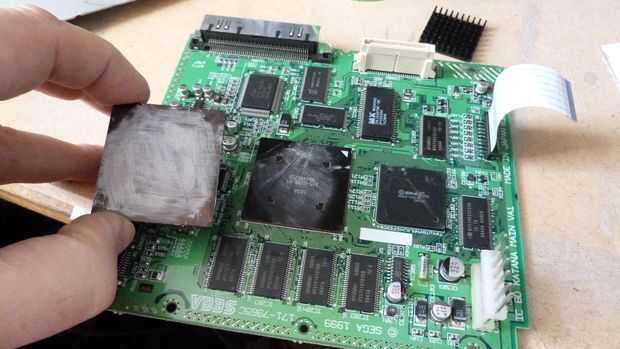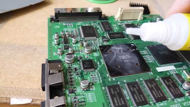 Aplicar un punto de pegamento en cada esquina del chip para el disipador de calor permanecerá firmemente en él (Foto 3).