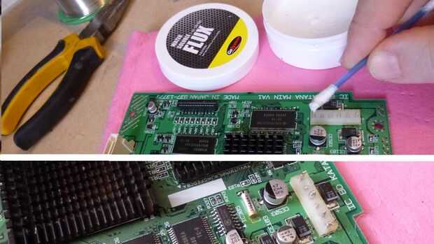 Aplicar flujo un poco a los pines en (Foto 3), luego de la soldadura, este "estañado" permite una articulación mucho más fuerte de la soldadura.