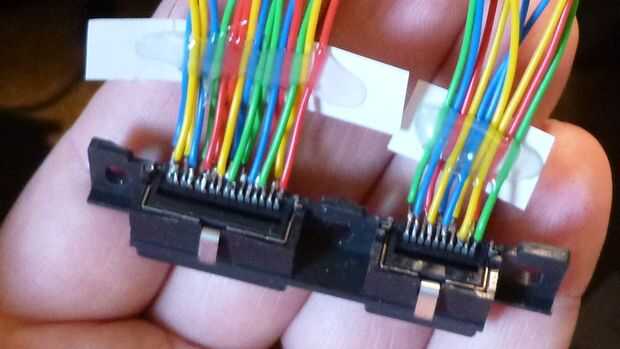Flujo y lata las clavijas (según el paso 6) y soldar los cables a las conexiones del perno (foto 4), entonces utilice pegamento caliente para mantenerlos en posición, aviso (Fig 5) he puesto los cables plano así que es fácil ver lo que se conecta a qué; pegamento caliente pega los cables a un pedazo de papel.