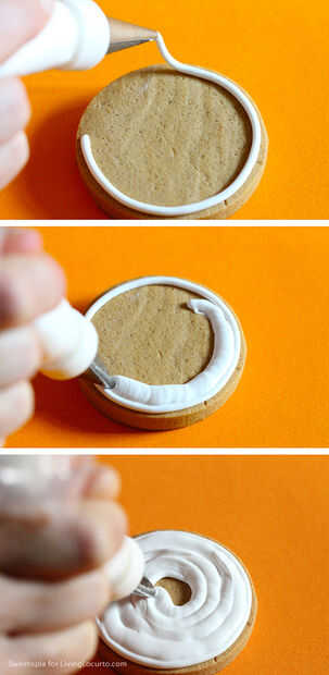 Una vez que tengas tus galletas al horno y glaseado hecho, es hora de comenzar por el esquema de tuberías. Me gusta usar una manga pastelera equipada con un acoplador y punta #3. Llenar o inunde tus galletas con glasé real blanco inmediato. Usted podría dejar el contorno para crear una presa sólida, pero usted podrá ver la frontera cuando el glaseado se seca.