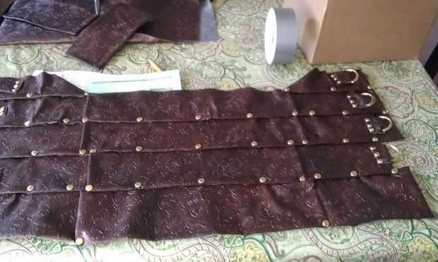 8.) Conecte uno de los extremos cortos de cada cinta en cada punto a lo largo de la coraza donde desee una hebilla que. Puede adjuntarlas al mismo lado o alternando lados, dependiendo del efecto que desea.