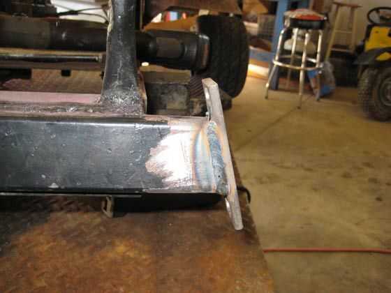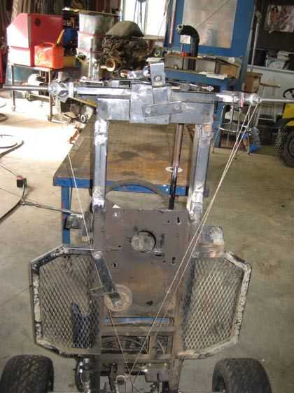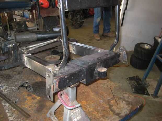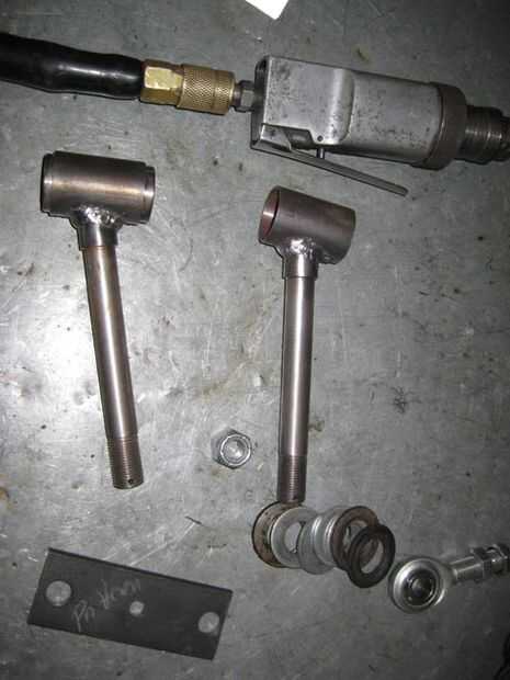 Los antiguos husos fueron cortados apagado del eje delantero. Reutilizar el viejo árbol en vez de instalar uno nuevo. Los nuevos ejes están completamente desenfundable en el eje y se montan con articulaciones heim grande. Las placas de montaje para los husos están soldadas a los extremos del eje y han trabajado a máquina tragamonedas para que los ejes se pueden girar hacia adelante o hacia atrás (que le da el ajuste de caster). Estas placas deben soldarse a los extremos del eje en un ángulo de 10 grados con la parte superior de las placas apuntando en hacia la podadora. Esto es fundamental porque esto a su vez le da la comba o el grado en que las ruedas se inclinan en hacia la podadora. Con este ajuste permitirá ajustar cuidadosamente el camber de una manera que ayudar a empujar más peso sobre la rueda delantera izquierda, lo que significa que serán capaces de "conectar" más fácilmente en las vueltas.