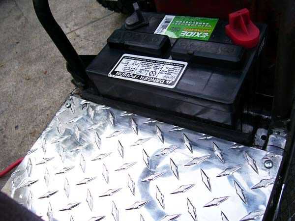Después de fue la instalación de las placas de piso de placa de diamante grueso. Éstos fueron cortados a la medida y atornilladas con tornillos autoperforantes para que ambos paneles se pueden retirar para mantenimiento RAGB, transmisión. El ajuste fue muy apretado y pegué sobre un trozo de goma a la batería para evitar la abrasión de la placa del diamante. El ajuste era perfecto y ajustado, que es lo que quieres con las baterías. Placa del diamante es algo costoso, así que pruebe y encuentre chatarra si se puede. Lo mismo se hizo para el guión, que es donde va la materia eléctrica.