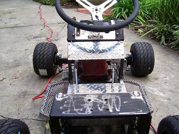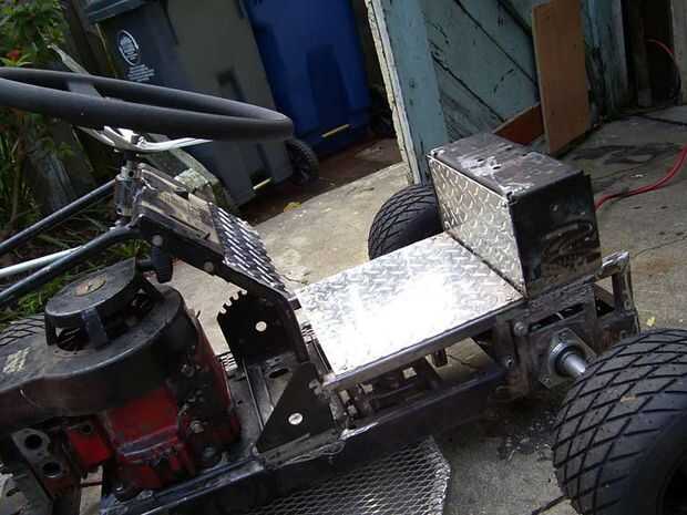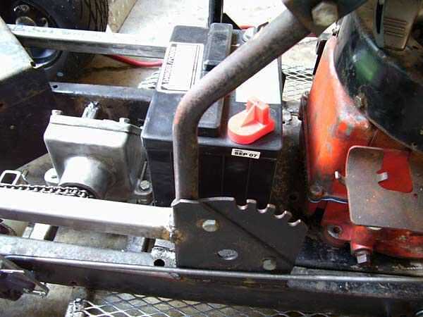 Luego instalé la batería, que era originalmente ir debajo del asiento. El asiento está sentado en la parte superior del soporte original que soldada directamente a la parte superior de la estructura de cubierta. Pero la batería era demasiado alta. Su era una batería de tractor de césped pequeño y el único lugar encajaría justo detrás del motor. Soldó con autógena dos pedazos de hierro de ángulo, apuntando hacia arriba para formar un soporte en el que se encuentra la batería. El espacio es apretado. Esto realmente funciona muy bien porque se mueve el centro de gravedad al centro de la podadora, añadiendo más estabilidad.