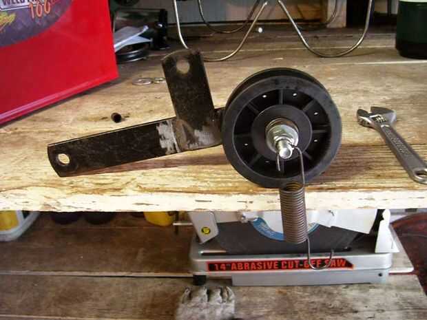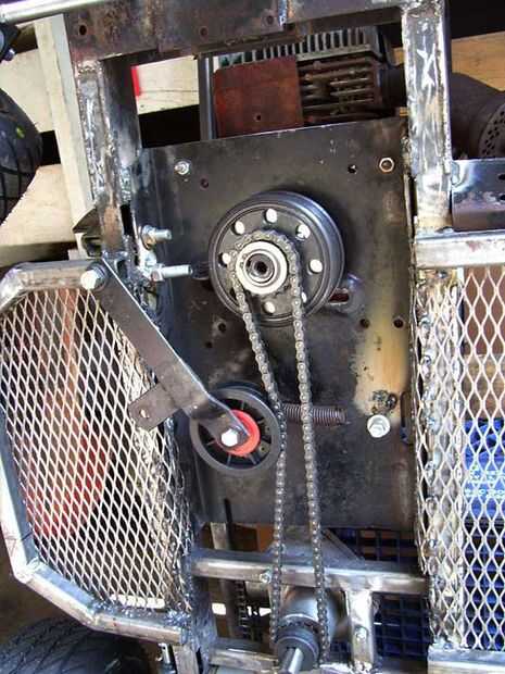 A continuación, me decidí a las ranuras de la máquina en la bandeja de montaje del motor. Hice en forma de ranuras que permitan el motor a deslizarse hacia adelante y atrás para que la cadena puede ser equipada y tensada correctamente. Esta es la cadena más larga en la construcción, así un tensor de resorte se fabricó además. Desde aquí la cadena cuelga horizontalmente, usted quiere tener constante, se aplica una presión suave para evitar que se caiga. El tensor es simple, utilizando una polea de nylon canalizados inactivo que normalmente se utiliza en cubiertas de cortacéspedes. Como la rueda del patín, nylon sostiene justo fin de cadena. La polea se monta en un brazo que está atornillado a la parte inferior de la plataforma del cortacésped simulada mediante una tuerca nylock y un tornillo. Un resorte se une a él como un perno soldado a la parte inferior de la bandeja del motor. Como se puede ver, la cadena se adapta muy bien del embrague centrífugo a la RAGB.