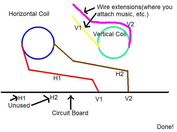 Desoldar la bobina vertical si no ya y sujete el alambre extra a la bobina vertical, esto tendrá que ser lo suficientemente largos para salir de la TV por lo que se puede conectar una fuente de tensión. Ahora desoldar la bobina horizontal y soldadura a donde estaba la bobina vertical.
