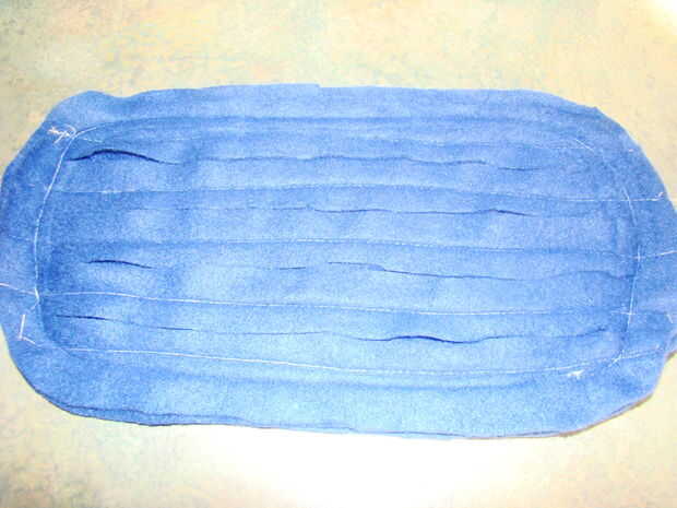 Quitar de la cabeza del trapeador.  Dan la vuelta y con sus tijeras de costura, corte la capa superior (ahora) de lana a medio camino entre las líneas de costura de 1 pulgada.