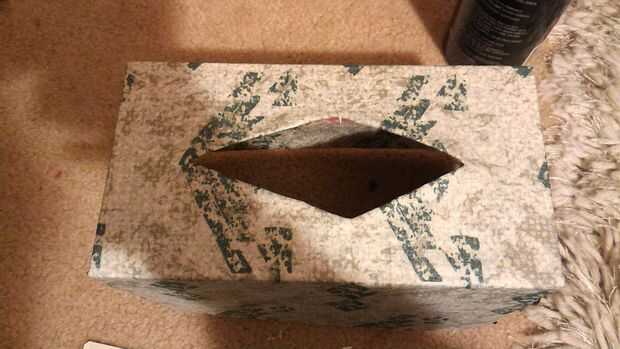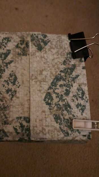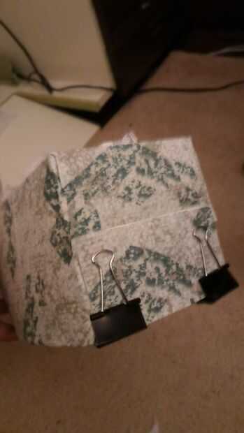 Después de 20 minutos el pegamento se haya secado para que pueda pellizcar los pliegues y rocíe las solapas con pegamento donde se Contacta con ellos. Luego corte dos plazas de lo que fue la parte inferior de la caja, pegamento de tela en y abrigo sobre cada borde para que sea aseado. Luego marcar en cada extremo de la caja con la Plaza, donde toca a las aletas y rociar la zona de la aleta y cierre la tapa con una pinza de bulldog. Pulse todas las áreas que están pegando y déjelo para secar. Mantener control y presionar las zonas pegadas. Por último, pegue las áreas de tela que se pliegan los bordes, luego doblar para hacer limpia y cierre con clips bulldog.