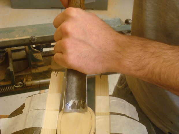 Gubia de uso hacer cóncava cuchara, cuidadosamente afeitado y quitando la madera hasta la profundidad de escote deseada. Sostenga la gubia en forma controlada para evitar lesiones y daños irreversibles a la cuchara. (Nota siguiente temas de seguridad)