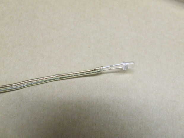El primer LED se inserta en el extremo del cable. Elegí este tipo de alambre por dos razones. La primera es que tiene una envoltura transparente que transmite parte de la luz hacia el lado contrario que el LED está montado sobre. Y la segunda es que el cable consiste en dos colores diferentes, una de plata y otros oro.