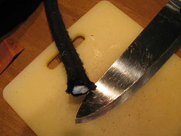 Primero mida 15' (o cualquier longitud que se desee) en la cuerda. Usando un cuchillo muy afilado o tijeras, con cuidado corte la cuerda a la longitud adecuada. Entonces, (otra vez, con cuidado), sellar el extremo de la cuerda con una vela o un encendedor. A veces ata el extremo con una ligadura ayuda a que el sello más cerca juntos.