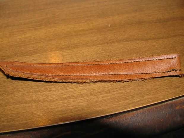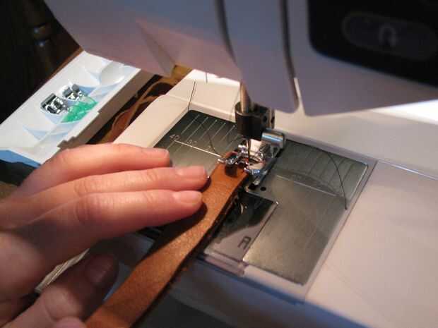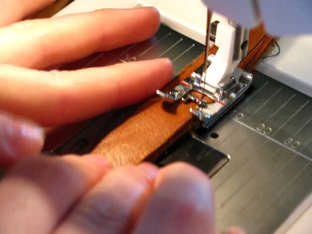 Iniciar en el lado derecho del doblez (como cortes en el redil, no hay necesidad para coser encima de él) y fijar el stich antes de ir abajo de la tira. Coser a 1/8 de pulgada para obtener mejores resultados. Al llegar a la inclinación, dejar la aguja en la piel, levante el pie prensatelas y gire el cuero para continuar la costura por el borde. Esto otra vez como sea necesario para el cuero. Al llegar al otro extremo, fijar la puntada otra vez y cortar los hilos. Hacer esto para todas las cuatro tiras.