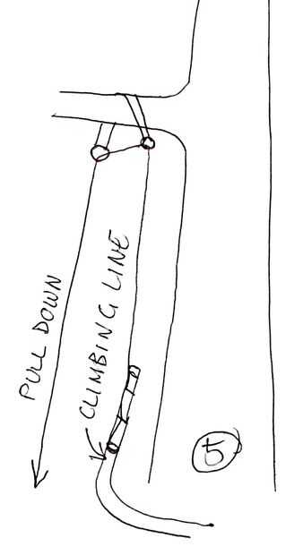 Tire de la throwline. La línea de escalada debe ejecutar, a través de los lazos del cambium saver y marcha atrás. Si se pega en el cámbium pequeño ahorrador de bucle, intente configurar el último enganche más cerca al final de la línea de escalada.