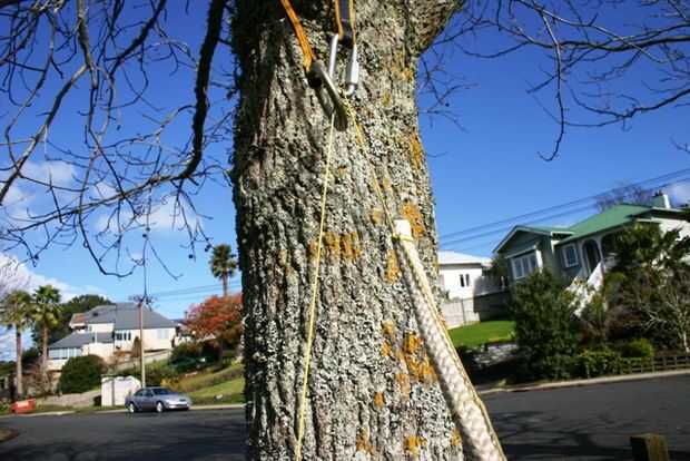 Ahora atar un par de tirones hacia la punta de la línea de escalada, con un enganche justo en la punta. La idea es que la línea de escalada siga throwline el árbol, a través de los lazos de cambium saver y hasta el suelo. ¿Tienes, eh?