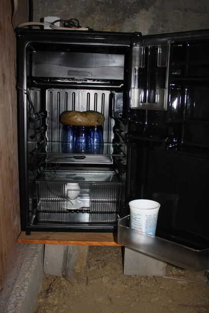 Cuando el regulador de temperatura del frigorífico, la humedad generalmente disminuye 10-15%, pero sube hasta alrededor del 80% en menos de una hora. Ya que es fresco en el crawlspace, la nevera no enciende mucho en todo y la temperatura se mantiene a la derecha alrededor 55° F.
