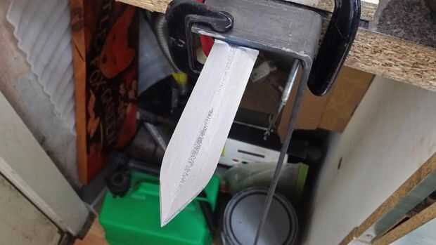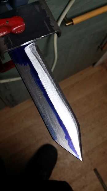 Como he dicho antes todo hasta este punto podría hacerse un mono entrenado bien este paso toma cierta habilidad, especialmente para tener (4) agradable plana, incluso recta nítida bisel, para ellos líneas te han hecho sea más o menos pulido para así llevarte es lijadora de banda, ángulo amoladora, archivo o lo que usted está usando y enciéndalo , esta parte es sencilla, convirtiéndose en eso, ahora la parte difícil, (lentamente) empezar a retirar la carne y tomar se hunde incluso agradable durante todo el de zona de la hoja, no gasto tiempo en cualquier parte de la hoja o moverse te estás ángulo como lo mueve a través de la blanco, moverlo en lenta y constante como va progresivamente movimiento más cercanas a usted están líneas , personalmente, utilicé una amoladora aquí es la clave de un disco pulido fresco agradable y más o menos a mis líneas de borde y un poco más a la reunión del borde en la parte superior de los cartabones pero quisiera algo en bruto y acabar con ellos con mis archivos, opción personal pero me resultan muy bien plana y uniforme, por lo que es el de todos modos , en el siguiente paso.