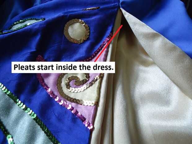Gire el vestido por lo que es de adentro hacia afuera. Coser la parte delantera del vestido y el vestido lado derecho lados juntos. Pase esta costura abajo del pliegue. Tuve que hacer esta parte con la mano; No pude obtener la máquina allí. Desea que el plisado para venir desde el interior del vestido. Si empiezas en la parte superior de la abertura, no pone derecho.