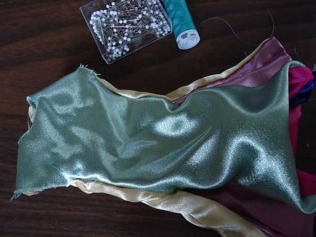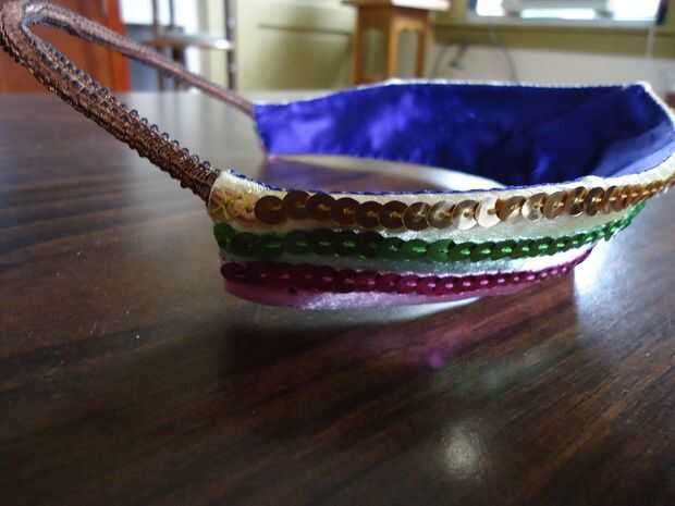Gire todo el lado derecho hacia fuera y ya está con el vestido. Entonces usted puede hacer la pieza principal y el cabo. Puedes ver el cabo de la primera foto. Poner los apliques en la parte delantera, coser al espalda derecho contra derecho junto dejando una abertura, luego gire y presione. La pieza principal se hizo en un marco de bocací nupcial. El cable estaba cubierto con una venda elástica que coincide con mi pelo.