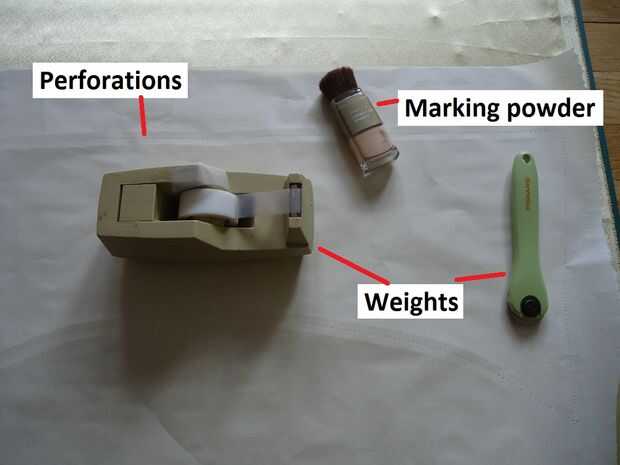 usé satén de crepe con superpuesta con organza a juego para conseguir sólo el brillo adecuado. Pone el satén en una superficie no resbaladiza como una almohadilla de corte para que no se mueva. Pone la organza sobre eso y pin todo. Poner el patrón de papel de pergamino en la parte superior, alinear con el grano y lo peso o perno hacia abajo. Yo pouncer de tiza de una quilter originalmente, pero este polvo de maquillaje casi funciona, también. Trabajo sobre las perforaciones hechas en el último paso. Esta técnica mantiene el satén de desplazamiento mientras se marca. No todos los apliques de color al mismo tiempo.
