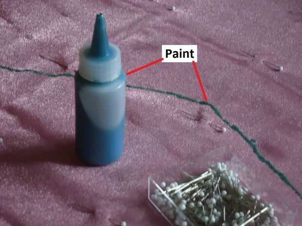 Si se corta a las formas como este, lucharé para mantener juntos los bordes. Usé pintura de tela que empareja (no coincidencia de aquí) para trazar las líneas. Esto básicamente pegadas las dos capas y me dio una línea fácil a seguir para recortar las formas. Probablemente puede utilizar pegamento o un cuchillo caliente si usas a tela que se derrite, pero no lo he probado.