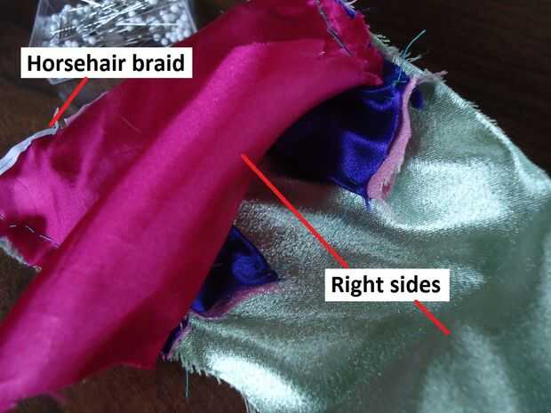 Coser el vestido delantero y delanteros derecho lados juntos en el dobladillo de la guarnición. Añadir una tira de malla de plástico hoarshair a la guarnición en el dobladillo. Hacer un sándwich de la parte frontal del vestido y plisado delanteros derecho lados juntos y el vestido de la guarnición frente y plisado de forro derecho contra derecho. Coser la costura hasta la parte superior de los pliegues. Repita con el otro pliegue. Se verá como un bolsillo de adentro hacia afuera con los pliegues rellenos dentro. La trenza de pelo de caballo mantiene el frente del vestido abierto para que pueda ver los diseños.