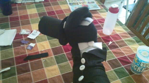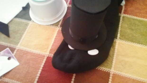 Tome su sombrero recién hecha y el pegamento en la parte superior de la cabeza de la media. Personalmente hice mío para que el sombrero cubre un poco más de un ojo, pero no tienes que hacer eso. Ser creativos, encontrar lo que funciona para usted. También podría comprar un diminuto sombrero de copa en su tienda de artesanía local... Si tienes uno. No, por eso hice uno.