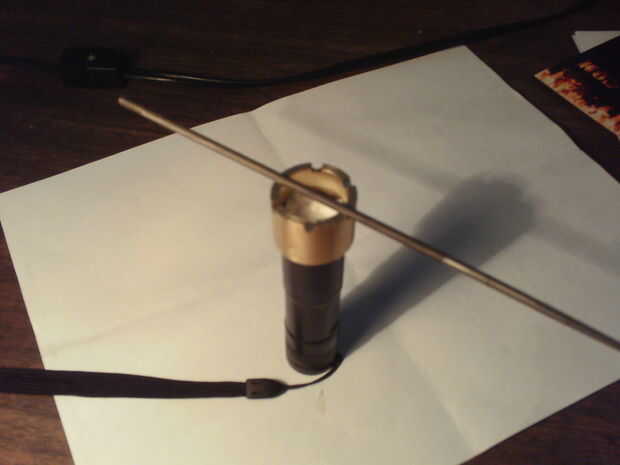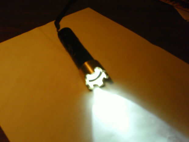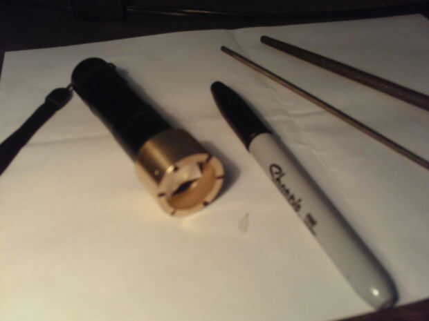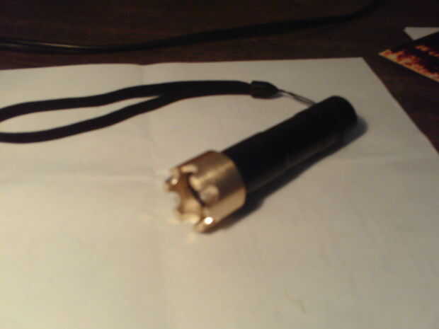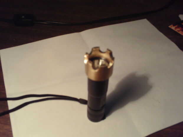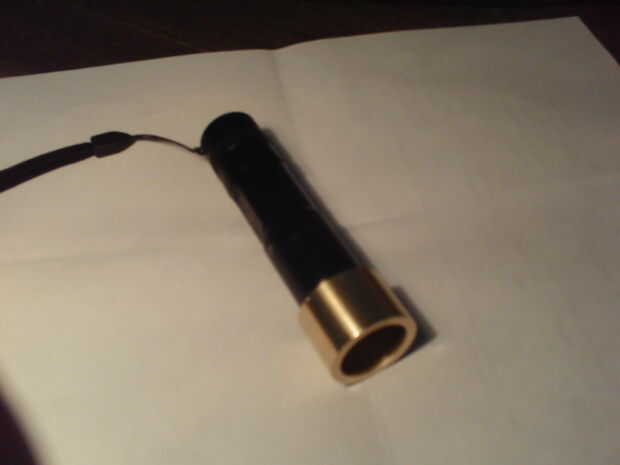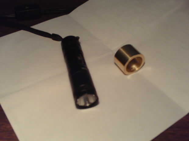 Foto 1: Ves mi OLight T-10, (que es dirigido por una sola batería CR123A), junto con el buje. Ponga un trozo de cinta adhesiva sobre la lente para protección.