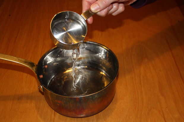 Mida 1/2 taza de agua en una cacerola.