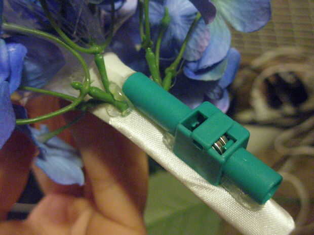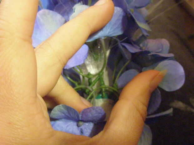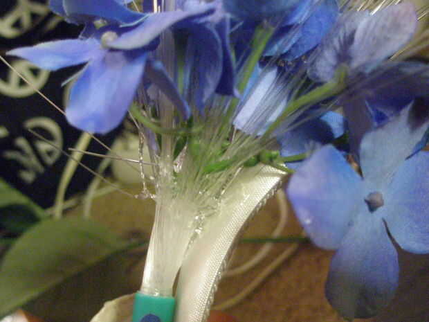 Mi flor se armó tres racimos que pudieron ser separados. Comencé en la parte superior y encolar un manojo, distribución de las fibras de la fibra óptica alrededor de él. Los otros dos racimos cortó en tres más pequeños racimos cada uno. Racimos de estos más pequeños son más fáciles de trabajar y organizar. Pegué tres de racimos más pequeños hacia arriba, en la misma dirección que el primer racimo pegué abajo. Entonces pegué dos más pequeños racimos hacia abajo, en la dirección opuesta. No desea que todas las flores frente a la misma manera. Si se enfrentan a diferentes direcciones, la hace ver más realista y es más fácil ocultar la base de la luz. Asegúrese de que no pegue el interruptor on/off o la puerta de la batería!