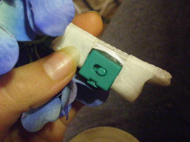 Pegue la luz hacia abajo. Tiene un interruptor de un lado y una pequeña puerta en el otro lado para baterías y quería que su bot el interruptor y la puerta no se pega abajo. Utilice las flores de cinta a cinta sobre las partes coloreadas de la luz y asegurar más firmemente las fibras de la fibra óptica. No cinta sobre el interruptor o el compartimento de pilas!